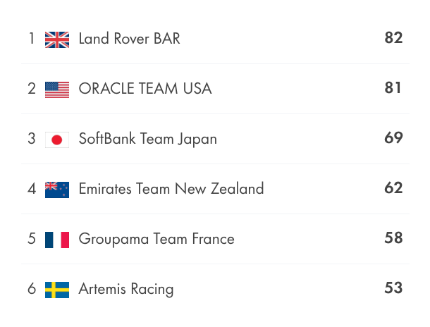 Oracle takes over second place overall, pushing the Kiwis into third. New Zealand had big gaps on board in the two most important positions: Ray Davies handled wing trim for the first time since wing trimmer Glenn Ashby was on the helm replacing Peter Burling, off in Rio to prepare for the Olympics. Like Team New Zealand, Artemis was without their regular helmsman. Nathan Outteridge is also in Rio, hoping to defend his 2012 gold medal against silver medalist Burling. Francesco Bruni stepped in as helmsman – his first time ever to sail an AC45F. The rules prevent sailing the AC45F’s between events. The conditions were different each day, so there was no chance for Bruni to learn the boat. Artemis finished last in Portsmouth – a frustrating result after their win in Chicago last month.