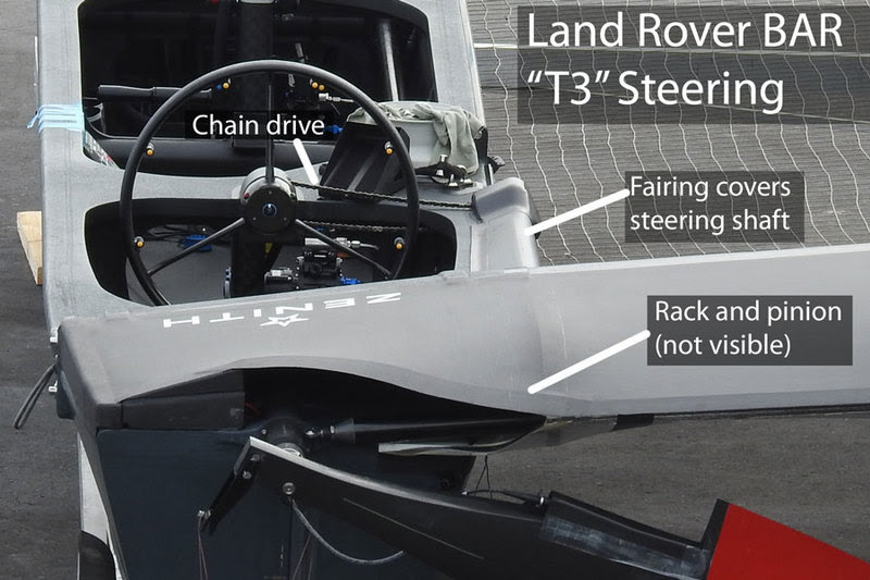 If we take a closer look we can see they have a unique steering linkage, unlike the the other teams’ steering. It will be interesting to see if they have the same setup on their race boat – the rudders on the race boat will be mounted inside the hulls, not hung off the stern.