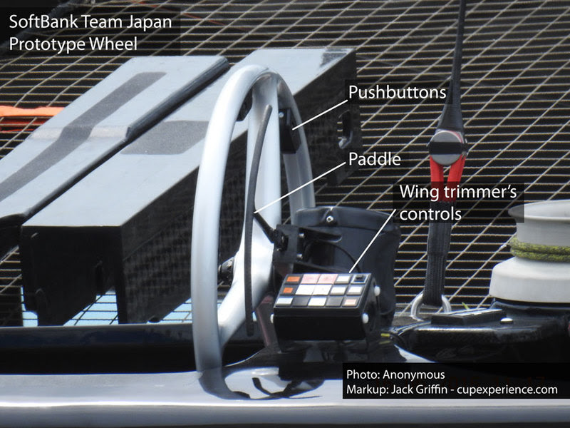 Zooming in a little more, we can see a series of yellow and blue buttons around the rim of the wheel. These may control the rake of the daggerboards. The helmsman adjusts the rake to control angle of attack of the underwater wing on the daggerboard. This varies the lift, to control ride height. If you look closely, you will also see a red and a green button on the hub of the wheel and a rotary switch right in the center of the wheel.