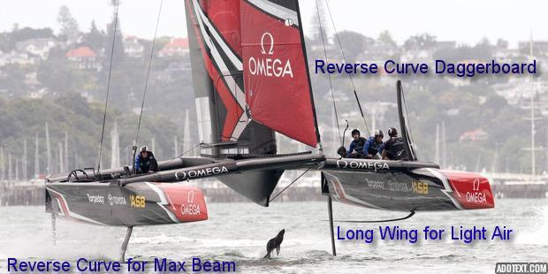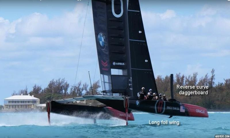 In a New York Times article, Oracle designer Scott Ferguson talks about longer daggerboard wings for light air and shorter daggerboard wings for medium to heavy air. Like the Kiwis, Oracle has been testing longer foil wings as this photo shows: