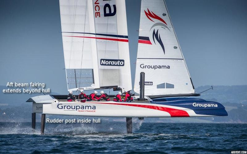 Groupama Team France mounted their rudders in the hulls so they can save money by using the rudders from the test boat in their race boat.