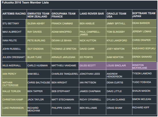 Each team is allowed 11 people who can “touch the boat” – the five man (highlighted in yellow) crew plus shore team and possibly a spare sailor (highlighted in red).