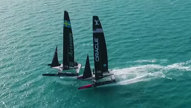 Ben’s wife Georgie Ainslie does a Facebook livestream from Bermuda every Monday. This week we’ll see their base opening celebration – no doubt with the traditional Bermudian roof-wetting ceremony. They will “reveal” their AC Class race yacht, but will they put the boat in the water? Any daggerboards in the boat when it is afloat count towards the four board limit.