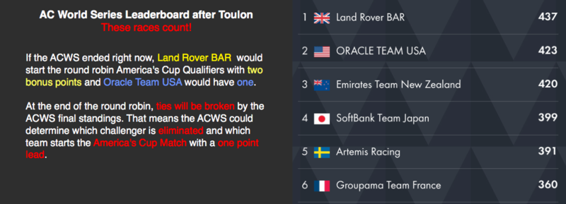In spite of breathless reports which explain that the winner of a race on Sunday scores 20 points, it won’t be so easy for any of the teams to move up the leaderboard. Consider this: If the weather cooperates and all races are sailed, the most one team can improve over another is 45 points. And this would mean one team wins every race, scoring a total of 90 points for the regatta, while the other team comes in last in every race, scoring 45. I give a full explanation of the standings here. Short version: Land Rover BAR is in a strong position to win the series and take the two bonus points. Oracle and Team New Zealand will be battling for second place and the remaining bonus point.